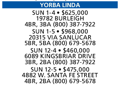 5BR, 3BA (800) 856-9352 YORBA LINDA SUN 1-4 • $625,000 19782 BURLEIGH 4BR, 3BA (800) 387-7922 SUN 1-5 • $968,000 20315 VIA SANLUCAR 5BR, 5BA (800) 679-5678 SUN 12-4 • $460,000 6089 KINGSBRIAR DRIVE 3BR, 2BA (800) 387-7922 SUN 12-5 • $475,000 4882 W. SANTA FE STREET 4BR, 2BA (800) 679-5678