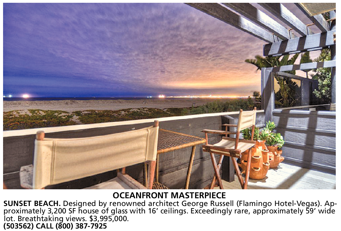 OCEANFRONT MASTERPIECE SUNSET BEACH. Designed by renowned architect George Russell (Flamingo Hotel-Vegas). Approximately 3,200 SF house of glass with 16’ ceilings. Exceedingly rare, approximately 59’ wide lot. Breathtaking views. $3,995,000. (503562) CALL (800) 387-7925