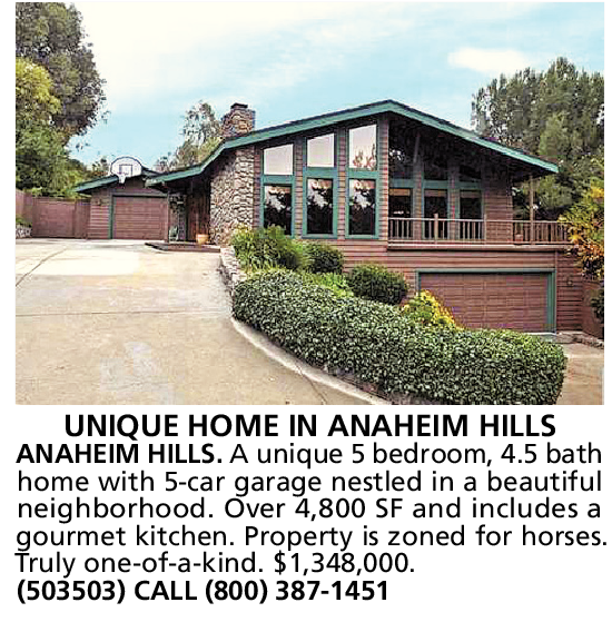 UNIQUE HOME IN ANAHEIM HILLS ANAHEIM HILLS. A unique 5 bedroom, 4.5 bath home with 5-car garage nestled in a beautiful neighborhood. Over 4,800 SF and includes a gourmet kitchen. Property is zoned for horses. Truly one-of-a-kind. $1,348,000. (503503) CALL (800) 387-1451