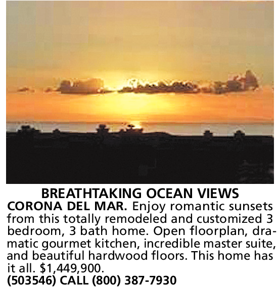 BREATHTAKING OCEAN VIEWS CORONA DEL MAR. Enjoy romantic sunsets from this totally remodeled and customized 3 bedroom, 3 bath home. Open floorplan, dramatic gourmet kitchen, incredible master suite, and beautiful hardwood floors. This home has it all. $1,449,900. (503546) CALL (800) 387-7930
