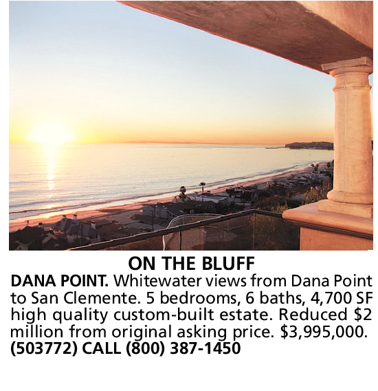 ON THE BLUFF DANA POINT. Whitewater views from Dana Point to San Clemente. 5 bedrooms, 6 baths, 4,700 SF high quality custom-built estate. Reduced $2 million from original asking price. $3,995,000.