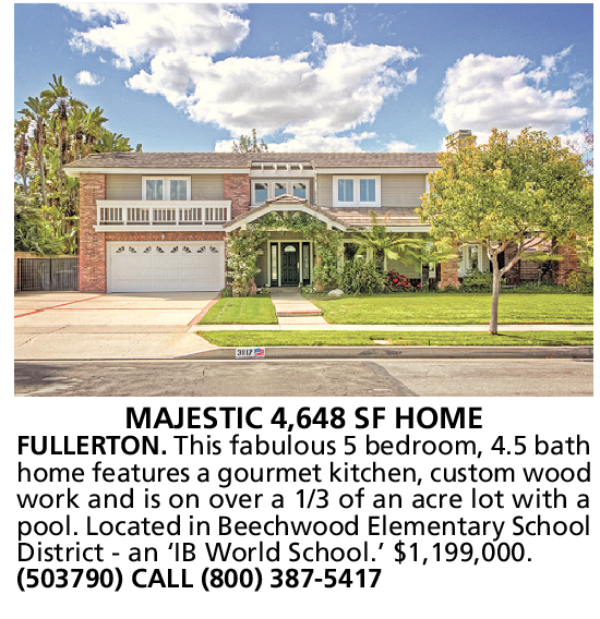 MAJESTIC 4,648 SF HOME FULLERTON. This fabulous 5 bedroom, 4.5 bath home features a gourmet kitchen, custom wood work and is on over a 1/3 of an acre lot with a pool. Located in Beechwood Elementary School District - an ‘IB World School.’ $1,199,000. (503790) CALL (800) 387-5417