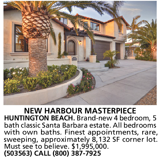 NEW HARBOUR MASTERPIECE HUNTINGTON BEACH. Brand-new 4 bedroom, 5 bath classic Santa Barbara estate. All bedrooms with own baths. Finest appointments, rare, sweeping, approximately 8,132 SF corner lot. Must see to believe. $1,995,000. (503563) CALL (800) 387-7925