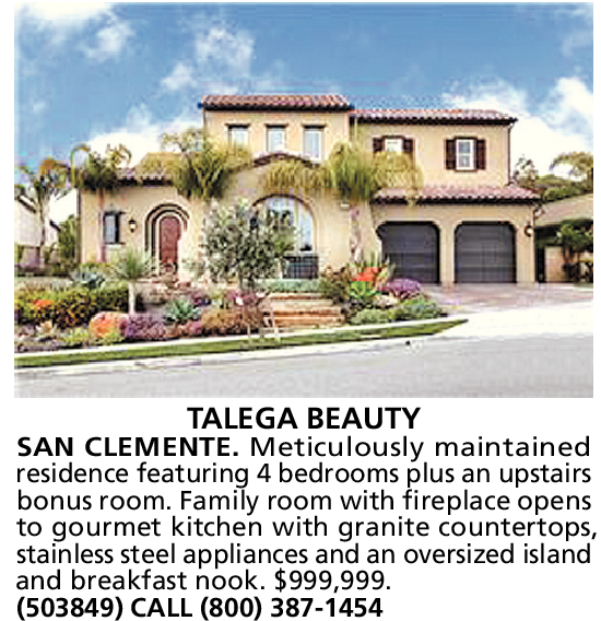 TALEGA BEAUTY SAN CLEMENTE. Meticulously maintained residence featuring 4 bedrooms plus an upstairs bonus room. Family room with fireplace opens to gourmet kitchen with granite countertops, stainless steel appliances and an oversized island and breakfast nook. $999,999.