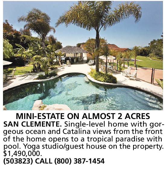 MINI-ESTATE ON ALMOST 2 ACRES SAN CLEMENTE. Single-level home with gorgeous ocean and Catalina views from the front of the home opens to a tropical paradise with pool. Yoga studio/guest house on the property. $1,490,000. (503823) CALL (800) 387-1454