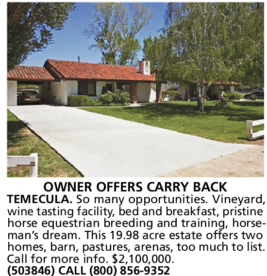 OWNER OFFERS CARRY BACK TEMECULA. So many opportunities. Vineyard, wine tasting facility, bed and breakfast, pristine horse equestrian breeding and training, horseman’s dream. This 19.98 acre estate offers two homes, barn, pastures, arenas, too much to list. Call for more info. $2,100,000. (503846) CALL (800) 856-9352