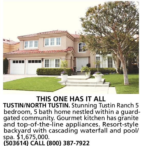 THIS ONE HAS IT ALL TUSTIN/NORTH TUSTIN. Stunning Tustin Ranch 5 bedroom, 5 bath home nestled within a guardgated community. Gourmet kitchen has granite and top-of-the-line appliances. Resort-style backyard with cascading waterfall and pool/ spa. $1,675,000. (503614) CALL (800) 387-7922