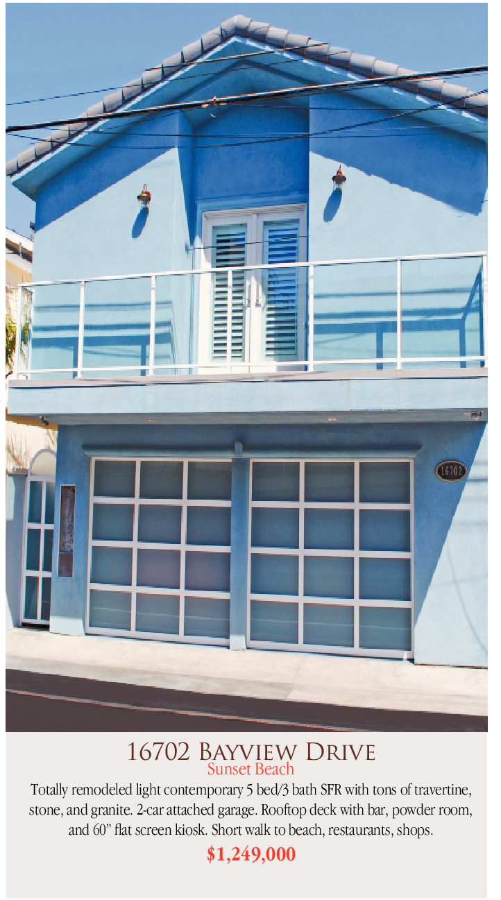 16702 Bayview Drive Sunset Beach Totally remodeled light contemporary 5 bed/3 bath SFR with tons of travertine, stone, and granite. 2-car attached garage. Rooftop deck with bar, powder room, and 60” flat screen kiosk. Short walk to beach, restaurants, shops.