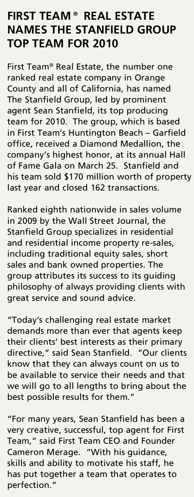 FIRST TEAM® REAL ESTATE nAMES ThE STAnFIELd GRoup Top TEAM FoR 2010 First Team ® Real Estate, the number one ranked real estate company in Orange County and all of California, has named The Stanfield Group, led by prominent agent Sean Stanfield, its top producing team for 2010. The group, which is based in First Team’s Huntington Beach – Garfield office, received a Diamond Medallion, the company’s highest honor, at its annual Hall of Fame Gala on March 25. Stanfield and his team sold $170 million worth of property last year and closed 162 transactions. Ranked eighth nationwide in sales volume in 2009 by the Wall Street Journal, the Stanfield Group specializes in residential and residential income property re-sales, including traditional equity sales, short sales and bank owned properties. The group attributes its success to its guiding philosophy of always providing clients with great service and sound advice. “Today’s challenging real estate market demands more than ever that agents keep their clients’ best interests as their primary directive,” said Sean Stanfield. “Our clients know that they can always count on us to be available to service their needs and that we will go to all lengths to bring about the best possible results for them.” “For many years, Sean Stanfield has been a very creative, successful, top agent for First Team,” said First Team CEO and Founder Cameron Merage. “With his guidance, skills and ability to motivate his staff, he has put together a team that operates to perfection.”