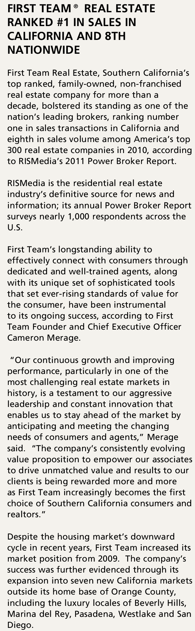 First Team Real Estate, Southern California’s top ranked, family-owned, non-franchised real estate company for more than a decade, bolstered its standing as one of the nation’s leading brokers, ranking number one in sales transactions in California and eighth in sales volume among America’s top 300 real estate companies in 2010, according to RISMedia’s 2011 Power Broker Report.