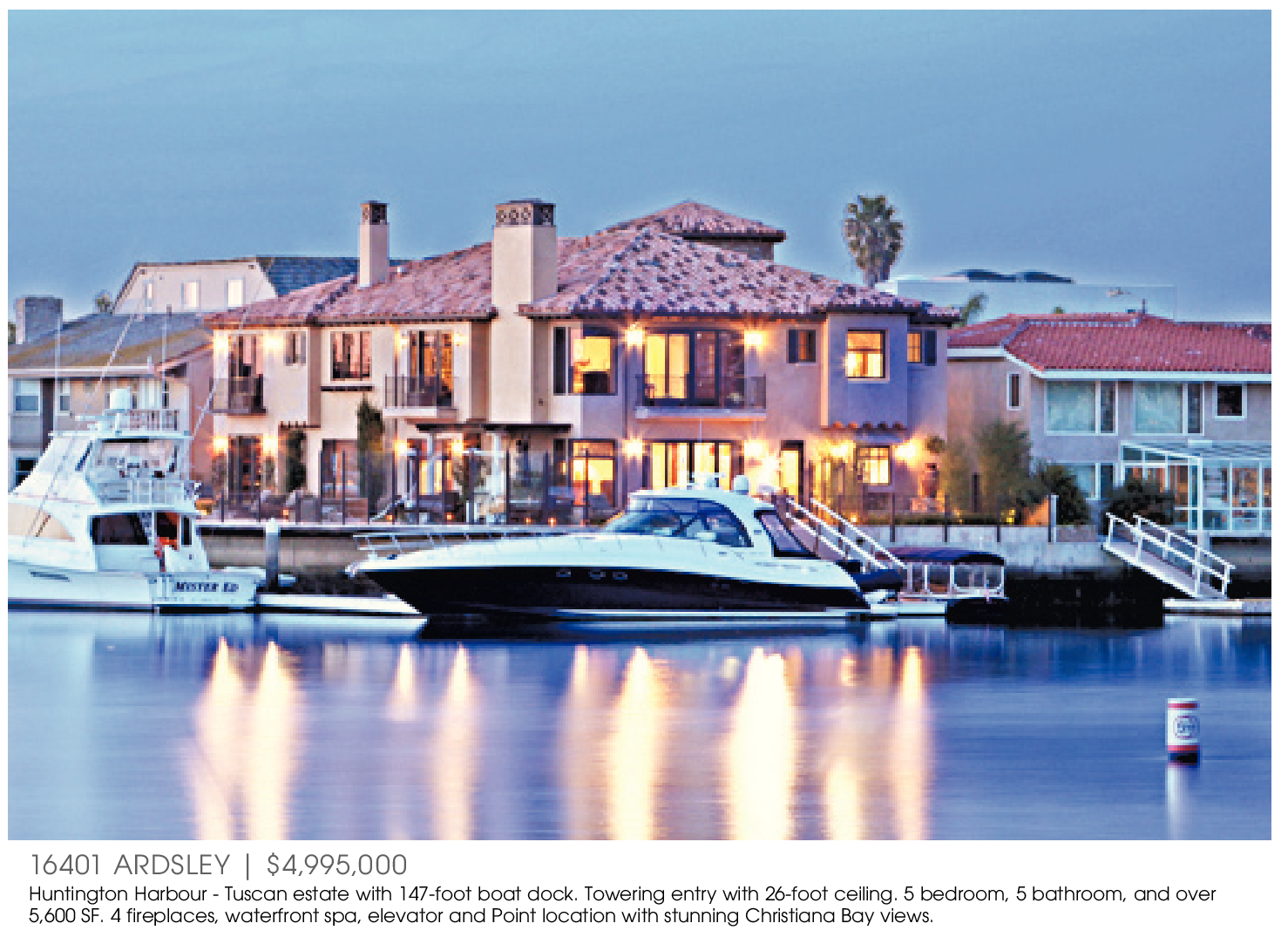 16401 ARDSLEY | $4,995,000 Huntington Harbour - Tuscan estate with 147-foot boat dock. Towering entry with 26-foot ceiling. 5 bedroom, 5 bathroom, and over 5,600 SF. 4 fireplaces, waterfront spa, elevator and Point location with stunning Christiana Bay views.