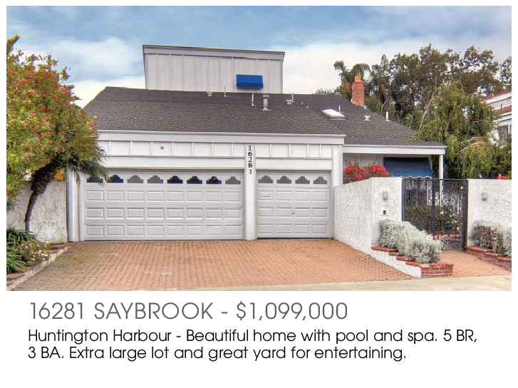 16281 SAYBROOK - $1,099,000 Huntington Harbour - Beautiful home with pool and spa. 5 BR, 3 BA. Extra large lot and great yard for entertaining.