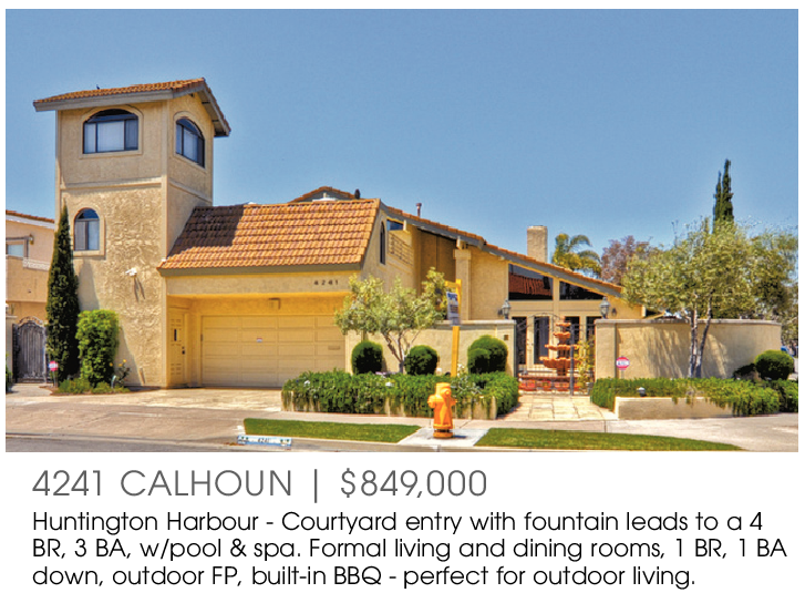 4241 CALHOUN | $849,000 Huntington Harbour - Courtyard entry with fountain leads to a 4 BR, 3 BA, w/pool & spa. Formal living and dining rooms, 1 BR, 1 BA down, outdoor FP, built-in BBQ - perfect for outdoor living.