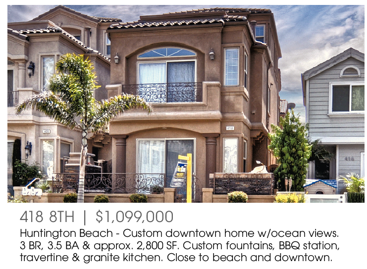 418 8TH | $1,099,000 Huntington Beach - Custom downtown home w/ocean views. 3 BR, 3.5 BA & approx. 2,800 SF. Custom fountains, BBQ station, travertine & granite kitchen. Close to beach and downtown.