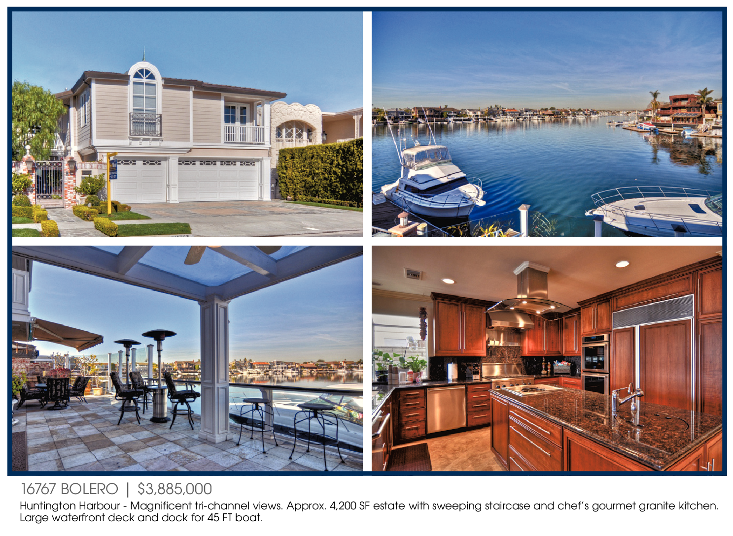 16767 BOLERO | $3,885,000 Huntington Harbour - Magnificent tri-channel views. Approx. 4,200 SF estate with sweeping staircase and chef’s gourmet granite kitchen. Large waterfront deck and dock for 45 FT boat.