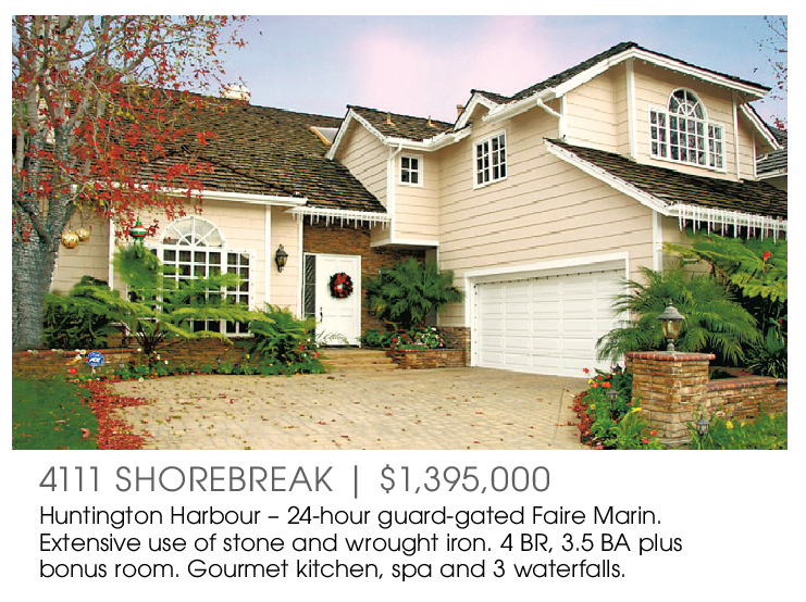 4111 SHOREBREAK | $1,395,000 Huntington Harbour – 24-hour guard-gated Faire Marin. Extensive use of stone and wrought iron. 4 BR, 3.5 BA plus bonus room. Gourmet kitchen, spa and 3 waterfalls.