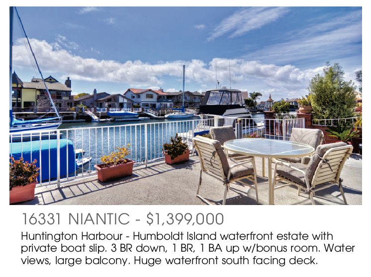 16331 NIANTIC - $1,399,000 Huntington Harbour - Humboldt Island waterfront estate with private boat slip. 3 BR down, 1 BR, 1 BA up w/bonus room. Water views, large balcony. Huge waterfront south facing deck.