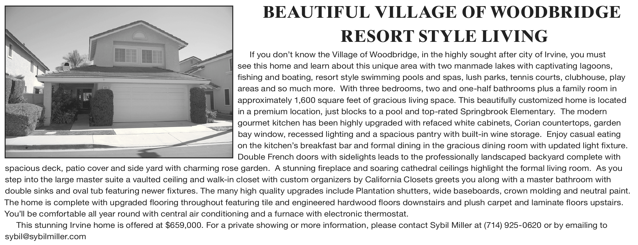 BEAUTIFUL VILLAGE OF WOODBRIDGE RESORT STYLE LIVING If you don’t know the Village of Woodbridge, in the highly sought after city of Irvine, you must see this home and learn about this unique area with two manmade lakes with captivating lagoons, fishing and boating, resort style swimming pools and spas, lush parks, tennis courts, clubhouse, play areas and so much more. With three bedrooms, two and one-half bathrooms plus a family room in approximately 1,600 square feet of gracious living space. This beautifully customized home is located in a premium location, just blocks to a pool and top-rated Springbrook Elementary. The modern gourmet kitchen has been highly upgraded with refaced white cabinets, Corian countertops, garden bay window, recessed lighting and a spacious pantry with built-in wine storage. Enjoy casual eating on the kitchen’s breakfast bar and formal dining in the gracious dining room with updated light fixture. Double French doors with sidelights leads to the professionally landscaped backyard complete with spacious deck, patio cover and side yard with charming rose garden. A stunning fireplace and soaring cathedral ceilings highlight the formal living room. As you step into the large master suite a vaulted ceiling and walk-in closet with custom organizers by California Closets greets you along with a master bathroom with double sinks and oval tub featuring newer fixtures. The many high quality upgrades include Plantation shutters, wide baseboards, crown molding and neutral paint. The home is complete with upgraded flooring throughout featuring tile and engineered hardwood floors downstairs and plush carpet and laminate floors upstairs. You’ll be comfortable all year round with central air conditioning and a furnace with electronic thermostat. This stunning Irvine home is offered at $659,000. For a private showing or more information, please contact Sybil Miller at (714) 925-0620 or by emailing to sybil@sybilmiller.com