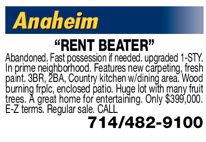 Anaheim “RENT BEATER” Abandoned. Fast possession if needed. upgraded 1-STY. In prime neighborhood. Features new carpeting, fresh paint. 3BR, 2BA, Country kitchen w/dining area. Wood burning frplc, enclosed patio. Huge lot with many fruit trees. A great home for entertaining. Only $399,000. E-Z terms. Regular sale. CALL 714/482-9100