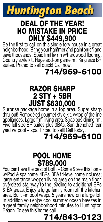 Huntington Beach DEAL OF THE YEAR! NO MISTAKE IN PRICE ONLY $449,900 Be the first to call on this single tory house in a great neighborhood. Bring your hammer and paintbrush and save thousands. Spac frml liv rm w/hardwood flooring. Country style kit. Huge add-on game rm. King size BR suites. Priced to sell quick! Call now! 714/969-6100 RAZOR SHARP 2 STY + 5BR JUST $630,000 Surprise package home in a top area. Super sharp thru-out! Remodeled gourmet style kit. w/top of the line appliances. Large frml living area. Spacious dining rm. Five full size BR suites plus 3BAs. Sun drenched rear yard w/ pool + spa. Priced to sell! Call today! 714/969-6100 POOL HOME $789,000 You can have the best of both – Come & see this home w/Pool & spa home. 4BRs, 3BA tri-level home includes; large entrance w/open living area on the main floor, oversized stairway to the leading to additional BRs & BA areas. Enjoy a large family room off the kitchen area. Built –in pool w/spa 5 years new on a large lot. In addition you enjoy cool summer ocean breezes in a great family neighborhood minutes to Huntington Beach. To see this home call 714/843-0123 See also