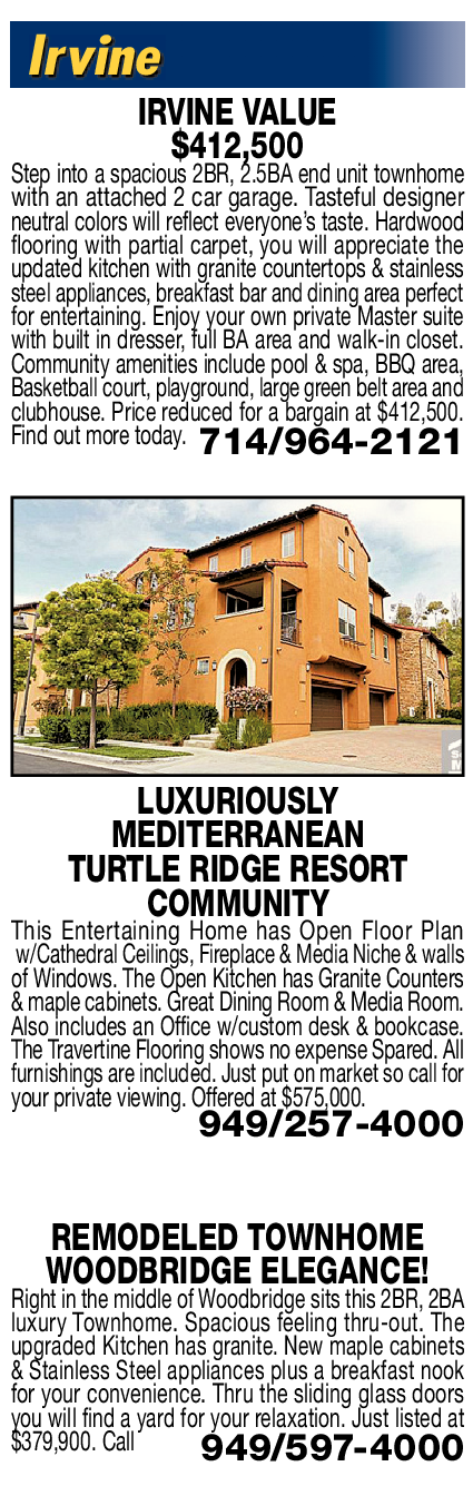 Irvine IRVINE VALUE $412,500 Step into a spacious 2BR, 2.5BA end unit townhome with an attached 2 car garage. Tasteful designer neutral colors will reflect everyone’s taste. Hardwood flooring with partial carpet, you will appreciate the updated kitchen with granite countertops & stainless steel appliances, breakfast bar and dining area perfect for entertaining. Enjoy your own private Master suite with built in dresser, full BA area and walk-in closet. Community amenities include pool & spa, BBQ area, Basketball court, playground, large green belt area and clubhouse. Price reduced for a bargain at $412,500. Find out more today. 714/964-2121 LUXURIOUSLY MEDITERRANEAN TURTLE RIDGE RESORT COMMUNITY This Entertaining Home has Open Floor Plan w/Cathedral Ceilings, Fireplace & Media Niche & walls of Windows. The Open Kitchen has Granite Counters & maple cabinets. Great Dining Room & Media Room. Also includes an Office w/custom desk & bookcase. The Travertine Flooring shows no expense Spared. All furnishings are included. Just put on market so call for your private viewing. Offered at $575,000. 949/257-4000 REMODELED TOWNHOME WOODBRIDGE ELEGANCE! Right in the middle of Woodbridge sits this 2BR, 2BA luxury Townhome. Spacious feeling thru-out. The upgraded Kitchen has granite. New maple cabinets & Stainless Steel appliances plus a breakfast nook for your convenience. Thru the sliding glass doors you will find a yard for your relaxation. Just listed at $379,900. Call 949/597-4000