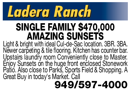 Ladera Ranch SINGLE FAMILY $470,000 AMAZING SUNSETS Light & bright with ideal Cul-de-Sac location. 3BR. 3BA. Newer carpeting & tile flooring. Kitchen has counter bar. Upstairs laundry room Conveniently close to Master. Enjoy Sunsets on the huge front enclosed Stonework Patio. Also close to Parks, Sports Field & Shopping. A Great Buy in today's Market. Call 949/597-4000