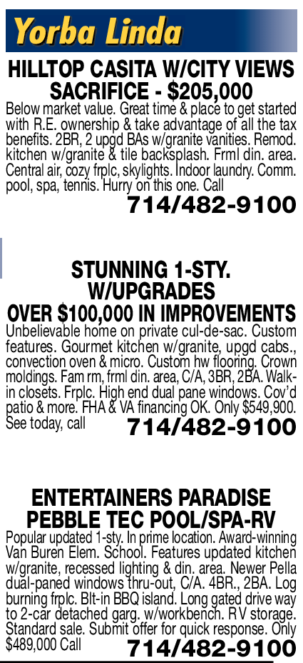 Yorba Linda HILLTOP CASITA W/CITY VIEWS SACRIFICE - $205,000 Below market value. Great time & place to get started with R.E. ownership & take advantage of all the tax benefits. 2BR, 2 upgd BAs w/granite vanities. Remod. kitchen w/granite & tile backsplash. Frml din. area. Central air, cozy frplc, skylights. Indoor laundry. Comm. pool, spa, tennis. Hurry on this one. Call 714/482-9100 STUNNING 1-STY. W/UPGRADES OVER $100,000 IN IMPROVEMENTS Unbelievable home on private cul-de-sac. Custom features. Gourmet kitchen w/granite, upgd cabs., convection oven & micro. Custom hw flooring. Crown moldings. Fam rm, frml din. area, C/A, 3BR, 2BA. Walkin closets. Frplc. High end dual pane windows. Cov’d patio & more. FHA & VA financing OK. Only $549,900. See today, call 714/482-9100 ENTERTAINERS PARADISE PEBBLE TEC POOL/SPA-RV Popular updated 1-sty. In prime location. Award-winning Van Buren Elem. School. Features updated kitchen w/granite, recessed lighting & din. area. Newer Pella dual-paned windows thru-out, C/A. 4BR., 2BA. Log burning frplc. Blt-in BBQ island. Long gated drive way to 2-car detached garg. w/workbench. R V storage. Standard sale. Submit offer for quick response. Only $489,000 Call 714/482-9100