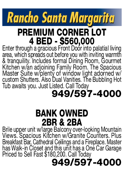 Rancho Santa Margarita PREMIUM CORNER LOT 4 BED - $560,000 Enter through a gracious Front Door into palatial living area, which spreads out before you with inviting warmth & tranquility. Includes formal Dining Room, Gourmet Kitchen w/an adjoining Family Room. The Spacious Master Suite w/plenty of window light adorned w/ custom Shutters. Also Dual Vanities. The Bubbling Hot Tub awaits you. Just Listed. Call Today 949/597-4000 BANK OWNED 2BR & 2BA Brile upper unit w/large Balcony over-looking Mountain Views. Spacious Kitchen w/Granite Counters. Plus Breakfast Bar, Cathedral Ceilings and a Fireplace. Master has Walk-in Closet and this unit has a One Car Garage Priced to Sell Fast $180,200. Call Today 949/597-4000