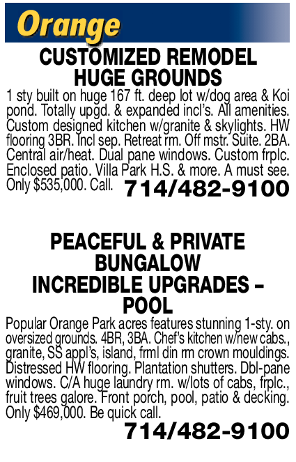 Orange CUSTOMIZED REMODEL HUGE GROUNDS 1 sty built on huge 167 ft. deep lot w/dog area & Koi pond. Totally upgd. & expanded incl’s. All amenities. Custom designed kitchen w/granite & skylights. HW flooring 3BR. Incl sep. Retreat rm. Off mstr. Suite. 2BA. Central air/heat. Dual pane windows. Custom frplc. Enclosed patio. Villa Park H.S. & more. A must see. Only $535,000. Call. 714/482-9100 PEACEFUL & PRIVATE BUNGALOW INCREDIBLE UPGRADES – POOL Popular Orange Park acres features stunning 1-sty. on oversized grounds. 4BR, 3BA. Chef’s kitchen w/new cabs., granite, SS appl’s, island, frml din rm crown mouldings. Distressed HW flooring. Plantation shutters. Dbl-pane windows. C/A huge laundry rm. w/lots of cabs, frplc., fruit trees galore. Front porch, pool, patio & decking. Only $469,000. Be quick call. 714/482-9100