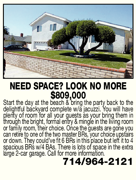 NEED SPACE? LOOK NO MORE $809,000 Start the day at the beach & bring the party back to the delightful backyard complete w/a jacuzzi. You will have plenty of room for all your guests as your bring them in through the bright, formal entry & mingle in the living room or family room, their choice. Once the guests are gone you can retire to one of the two master BRs, your choice upstairs or down. They could’ve fit 6 BRs in this place but left it to 4 spacious BRs w/4 BAs. There is lots of space in the extra large 2-car garage. Call for more information. 714/964-2121