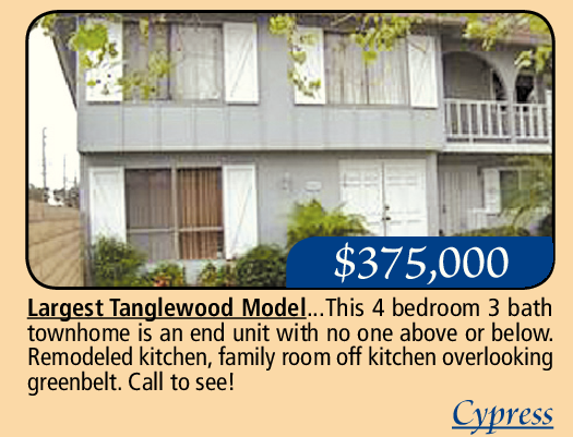Largest Tanglewood Model...This 4 bedroom 3 bath townhome is an end unit with no one above or below. Remodeled kitchen, family room off kitchen overlooking greenbelt. Call to see!