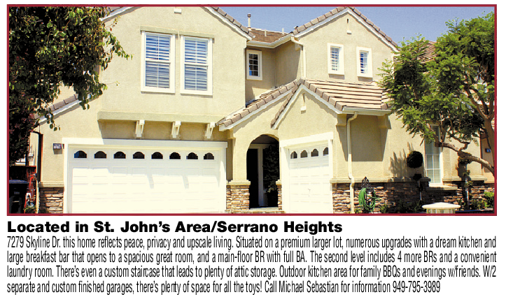 Located in St. John’s Area/Serrano Heights 7279 Skyline Dr. this home reflects peace, privacy and upscale living. Situated on a premium larger lot, numerous upgrades with a dream kitchen and large breakfast bar that opens to a spacious great room, and a main-floor BR with full BA. The second level includes 4 more BRs and a convenient laundry room. There’s even a custom staircase that leads to plenty of attic storage. Outdoor kitchen area for family BBQs and evenings w/friends. W/2 separate and custom finished garages, there’s plenty of space for all the toys! Call Michael Sebastian for information 949-795-3989
