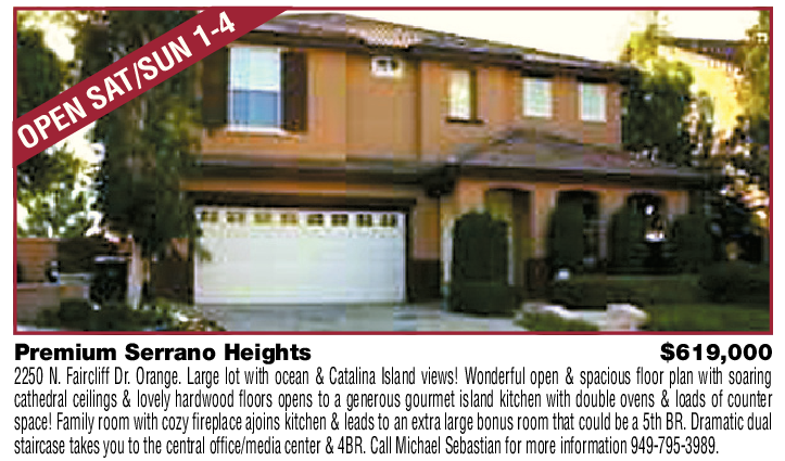 Premium Serrano Heights $619,000 2250 N. Faircliff Dr. Orange. Large lot with ocean & Catalina Island views! Wonderful open & spacious floor plan with soaring cathedral ceilings & lovely hardwood floors opens to a generous gourmet island kitchen with double ovens & loads of counter space! Family room with cozy fireplace ajoins kitchen & leads to an extra large bonus room that could be a 5th BR. Dramatic dual staircase takes you to the central office/media center & 4BR. Call Michael Sebastian for more information 949-795-3989.
