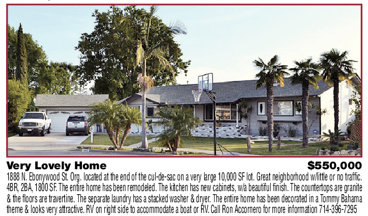 staircase takes you to the central office/media center & 4BR. Call Michael Sebastian for more information 949-795-3989. Very Lovely Home $550,000 1888 N. Ebonywood St. Org. located at the end of the cul-de-sac on a very large 10,000 SF lot. Great neighborhood w/little or no traffic. 4BR, 2BA, 1800 SF. The entire home has been remodeled. The kitchen has new cabinets, w/a beautiful finish. The countertops are granite & the floors are travertine. The separate laundry has a stacked washer & dryer. The entire home has been decorated in a Tommy Bahama theme & looks very attractive. RV on right side to accommodate a boat or RV. Call Ron Accornero for more information 714-396-7295