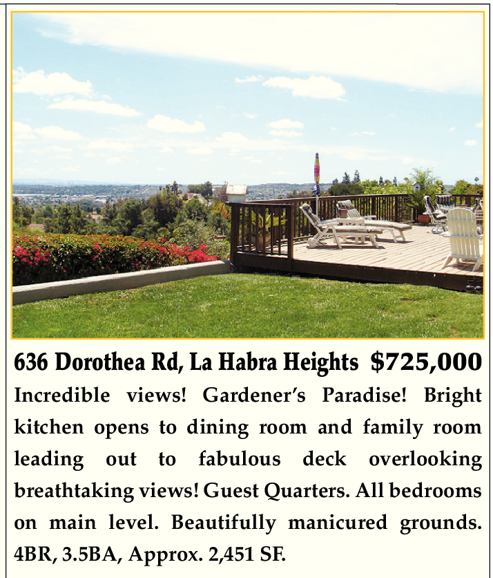 636 Dorothea Rd, La Habra Heights $725,000 Incredible views! Gardener’s Paradise! Bright kitchen opens to dining room and family room leading out to fabulous deck overlooking breathtaking views! Guest Quarters. All bedrooms on main level. Beautifully manicured grounds. 4BR, 3.5BA, Approx. 2,451 SF.