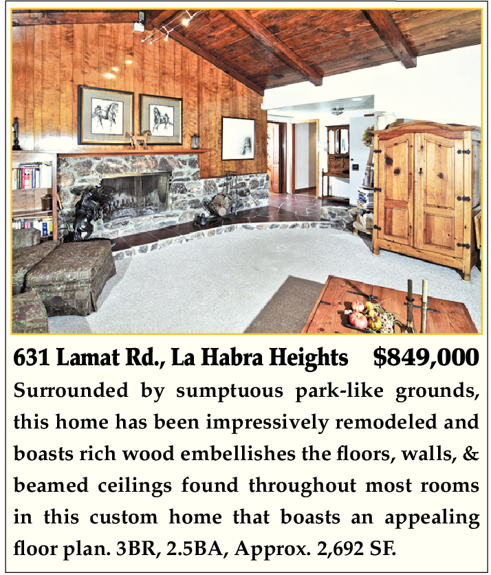 631 Lamat Rd., La Habra Heights $849,000 Surrounded by sumptuous park-like grounds, this home has been impressively remodeled and boasts rich wood embellishes the floors, walls, & beamed ceilings found throughout most rooms in this custom home that boasts an appealing floor plan. 3BR, 2.5BA, Approx. 2,692 SF.