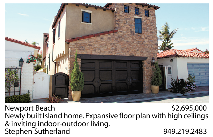Newport Beach $2,695,000 Newly built Island home. Expansive floor plan with high ceilings & inviting indoor-outdoor living. Stephen Sutherland 949.219.2483