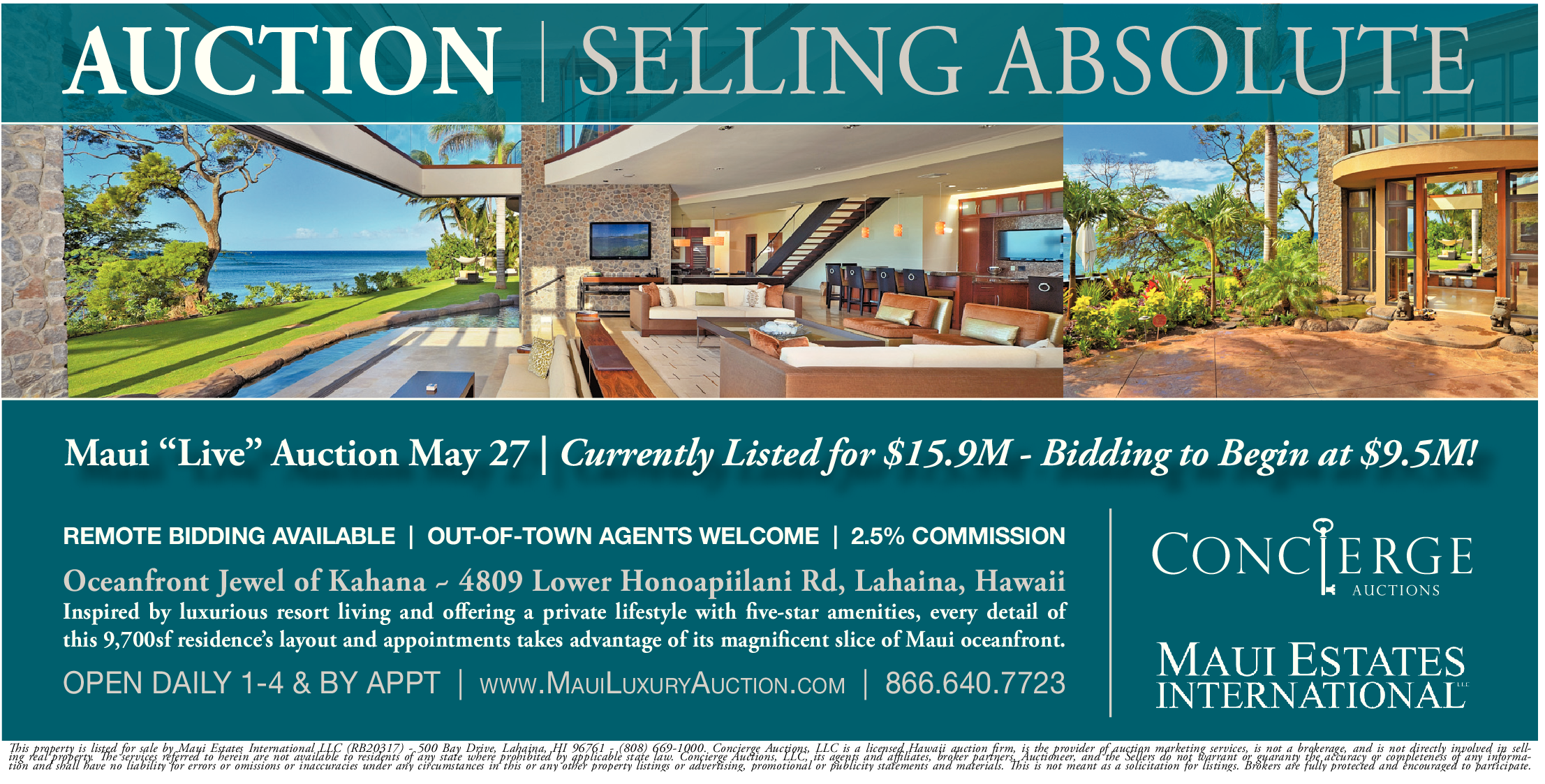 AUCTION SELLING ABSOLUTE Maui “Live” Auction May 27 | Currently Listed for $15.9M - Bidding to Begin at $9.5M! REMOTE BIDDING AVAILABLE | OUT-OF-TOWN AGENTS WELCOME | 2.5% COMMISSION Oceanfront Jewel of Kahana ~ 4809 Lower Honoapiilani Rd, Lahaina, Hawaii Inspired by luxurious resort living and offering a private lifestyle with five-star amenities, every detail of this 9,700sf residence’s layout and appointments takes advantage of its magnificent slice of Maui oceanfront. OPEN DAILY 1-4 & BY APPT | WWW.MAUILUXURYAUCTION.COM | 866.640.7723 This property is listed for sale by Maui Estates International LLC (RB20317) - 500 Bay Drive, Lahaina, HI 96761 - (808) 669-1000. Concierge Auctions, LLC is a licensed Hawaii auction firm, is the provider of auction marketing services, is not a brokerage, and is not directly involved in selling real property. The services referred to herein are not available to residents of any state where prohibited by applicable state law. Concierge Auctions, LLC, its agents and affiliates, broker partners, Auctioneer, and the Sellers do not warrant or guaranty the accuracy or completeness of any information and shall have no liability for errors or omissions or inaccuracies under any circumstances in this or any other property listings or advertising, promotional or publicity statements and materials. This is not meant as a solicitation for listings. Brokers are fully protected and encouraged to participate.
