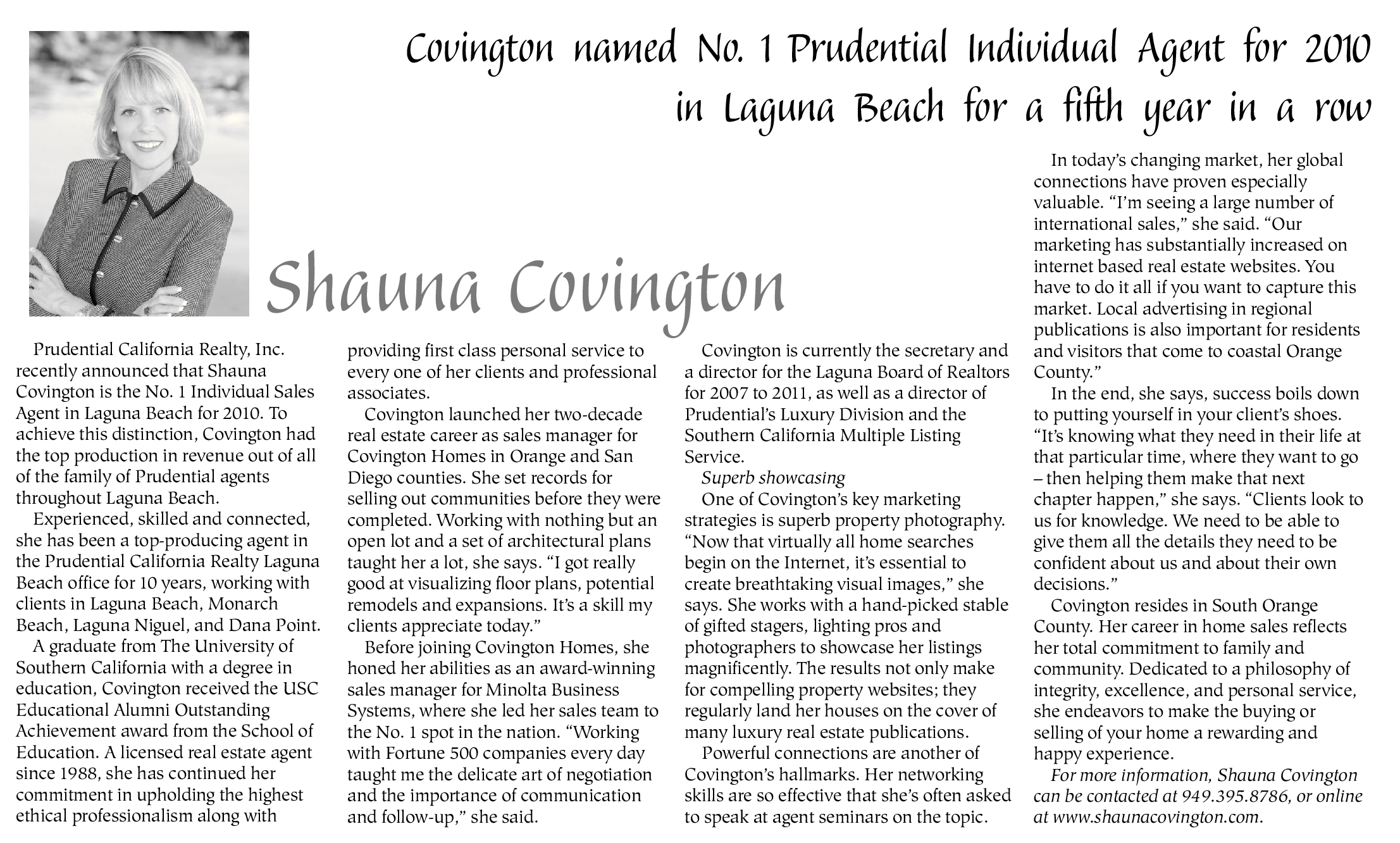 recently announced that Shauna Covington is the No. 1 Individual Sales Agent in Laguna Beach for 2010. To achieve this distinction, Covington had the top production in revenue out of all of the family of Prudential agents throughout Laguna Beach.