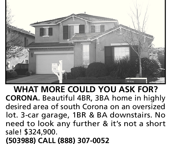 CORONA. Beautiful 4BR, 3BA home in highly desired area of south Corona on an oversized lot. 3-car garage, 1BR & BA downstairs. No need to look any further & it’s not a short sale! $324,900. (503988) CALL (888) 307-0052