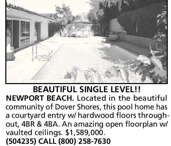 NEWPORT BEACH. Located in the beautiful community of Dover Shores, this pool home has a courtyard entry w/ hardwood floors throughout, 4BR & 4BA. An amazing open floorplan w/ vaulted ceilings. $1,589,000. (504235) CALL (800) 258-7630