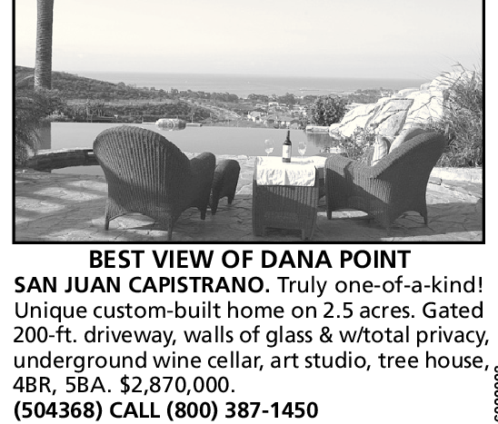 BEST VIEW OF DANA POINT SAN JUAN CAPISTRANO. Truly one-of-a-kind! Unique custom-built home on 2.5 acres. Gated 200-ft. driveway, walls of glass & w/total privacy, underground wine cellar, art studio, tree house,