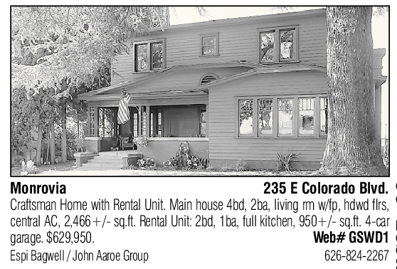 Monrovia 235 E Colorado Blvd. Craftsman Home with Rental Unit. Main house 4bd, 2ba, living rm w/fp, hdwd flrs, central AC, 2,466+/- sq.ft. Rental Unit: 2bd, 1ba, full kitchen, 950+/- sq.ft. 4-car garage. $629,950. Web# GSWD1 Espi Bagwell / John Aaroe Group 626-824-2267