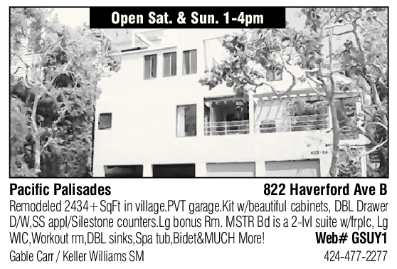 Open Sat. & Sun. 1-4pm Pacific Palisades 822 Haverford Ave B Remodeled 2434+SqFt in village.PVT garage.Kit w/beautiful cabinets, DBL Drawer D/W,SS appl/Silestone counters.Lg bonus Rm. MSTR Bd is a 2-lvl suite w/frplc, Lg WIC,Workout rm,DBL sinks,Spa tub,Bidet&MUCH More! Web# GSUY1 Gable Carr / Keller Williams SM 424-477-2277
