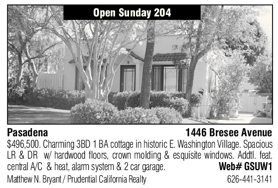 Open Sunday 204 Pasadena 1446 Bresee Avenue $496,500. Charming 3BD 1 BA cottage in historic E. Washington Village. Spacious LR & DR w/ hardwood floors, crown molding & esquisite windows. Addtl. feat. central A/C & heat, alarm system & 2 car garage. Web# GSUW1 Matthew N. Bryant / Prudential California Realty 626-441-3141