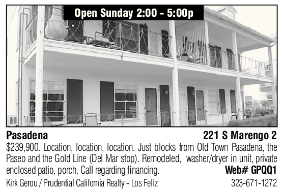 Open Sunday 2:00 - 5:00p Pasadena 221 S Marengo 2 $239,900. Location, location, location. Just blocks from Old Town Pasadena, the Paseo and the Gold Line (Del Mar stop). Remodeled, washer/dryer in unit, private enclosed patio, porch. Call regarding financing. Web# GPQQ1 Kirk Gerou / Prudential California Realty - Los Feliz 323-671-1272