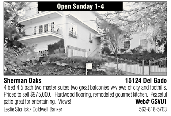 Open Sunday 1-4 Sherman Oaks 15124 Del Gado 4 bed 4.5 bath two master suites two great balconies w/views of city and foothills. Priced to sell $975,000. Hardwood flooring, remodeled gourmet kitchen. Peaceful patio great for entertaining. Views! Web# GSVU1 Leslie Stonick / Coldwell Banker 562-818-5763 See also