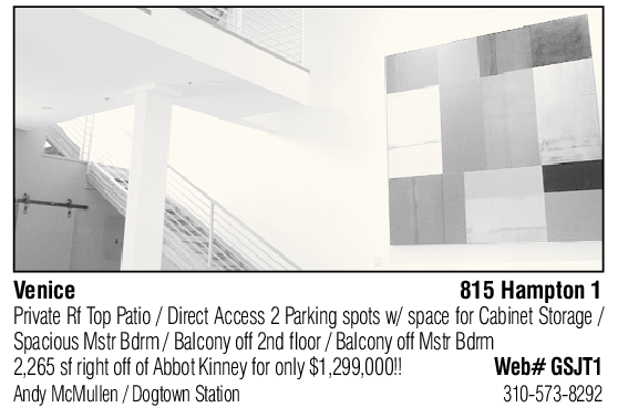 Venice 815 Hampton 1 Private Rf Top Patio / Direct Access 2 Parking spots w/ space for Cabinet Storage / Spacious Mstr Bdrm / Balcony off 2nd floor / Balcony off Mstr Bdrm 2,265 sf right off of Abbot Kinney for only $1,299,000!! Web# GSJT1 Andy McMullen / Dogtown Station 310-573-8292