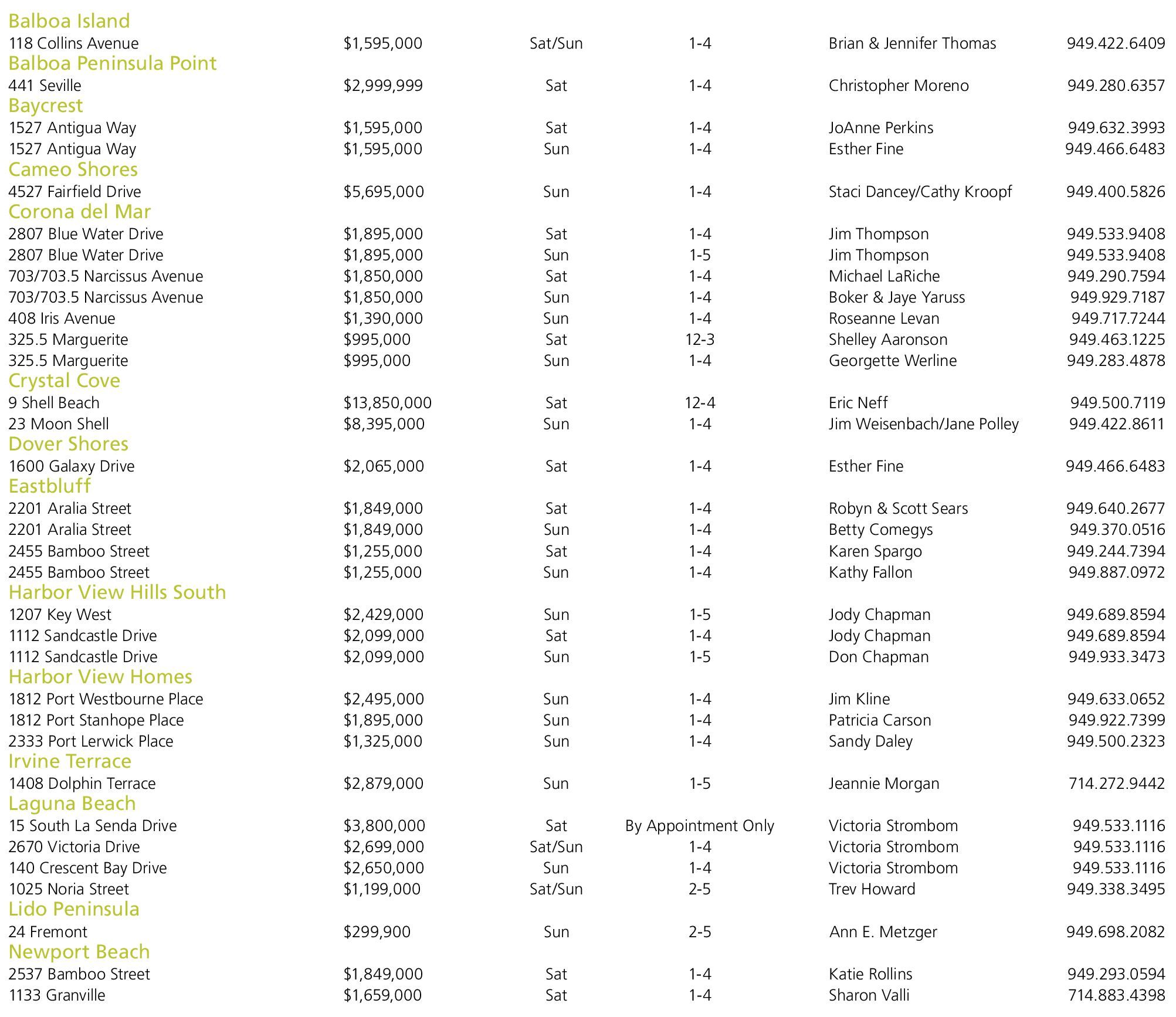 Balboa Island 118 Collins Avenue $1,595,000 Sat/Sun 1-4 Brian & Jennifer Thomas 949.422.6409 Balboa Peninsula Point 441 Seville $2,999,999 Sat 1-4 Christopher Moreno 949.280.6357 Baycrest 1527 Antigua Way $1,595,000 Sat 1-4 JoAnne Perkins 949.632.3993 1527 Antigua Way $1,595,000 Sun 1-4 Esther Fine 949.466.6483 Cameo Shores 4527 Fairfield Drive $5,695,000 Sun 1-4 Staci Dancey/Cathy Kroopf 949.400.5826 Corona del Mar 2807 Blue Water Drive $1,895,000 Sat 1-4 Jim Thompson 949.533.9408 2807 Blue Water Drive $1,895,000 Sun 1-5 Jim Thompson 949.533.9408 703/703.5 Narcissus Avenue $1,850,000 Sat 1-4 Michael LaRiche 949.290.7594 703/703.5 Narcissus Avenue $1,850,000 Sun 1-4 Boker & Jaye Yaruss 949.929.7187 408 Iris Avenue $1,390,000 Sun 1-4 Roseanne Levan 949.717.7244 325.5 Marguerite $995,000 Sat 12-3 Shelley Aaronson 949.463.1225 325.5 Marguerite $995,000 Sun 1-4 Georgette Werline 949.283.4878 Crystal Cove 9 Shell Beach $13,850,000 Sat 12-4 Eric Neff 949.500.7119 23 Moon Shell $8,395,000 Sun 1-4 Jim Weisenbach/Jane Polley 949.422.8611 Dover Shores 1600 Galaxy Drive $2,065,000 Sat 1-4 Esther Fine 949.466.6483 Eastbluff 2201 Aralia Street $1,849,000 Sat 1-4 Robyn & Scott Sears 949.640.2677 2201 Aralia Street $1,849,000 Sun 1-4 Betty Comegys 949.370.0516 2455 Bamboo Street $1,255,000 Sat 1-4 Karen Spargo 949.244.7394 2455 Bamboo Street $1,255,000 Sun 1-4 Kathy Fallon 949.887.0972 Harbor View Hills South 1207 Key West $2,429,000 Sun 1-5 Jody Chapman 949.689.8594 1112 Sandcastle Drive $2,099,000 Sat 1-4 Jody Chapman 949.689.8594 1112 Sandcastle Drive $2,099,000 Sun 1-5 Don Chapman 949.933.3473 Harbor View Homes 1812 Port Westbourne Place $2,495,000 Sun 1-4 Jim Kline 949.633.0652 1812 Port Stanhope Place $1,895,000 Sun 1-4 Patricia Carson 949.922.7399 2333 Port Lerwick Place $1,325,000 Sun 1-4 Sandy Daley 949.500.2323 Irvine Terrace 1408 Dolphin Terrace $2,879,000 Sun 1-5 Jeannie Morgan 714.272.9442 Laguna Beach 15 South La Senda Drive $3,800,000 Sat By Appointment Only Victoria Strombom 949.533.1116 2670 Victoria Drive $2,699,000 Sat/Sun 1-4 Victoria Strombom 949.533.1116 140 Crescent Bay Drive $2,650,000 Sun 1-4 Victoria Strombom 949.533.1116 1025 Noria Street $1,199,000 Sat/Sun 2-5 Trev Howard 949.338.3495 Lido Peninsula 24 Fremont $299,900 Sun 2-5 Ann E. Metzger 949.698.2082 Newport Beach 2537 Bamboo Street $1,849,000 Sat 1-4 Katie Rollins 949.293.0594 1133 Granville $1,659,000 Sat 1-4 Sharon Valli 714.883.4398