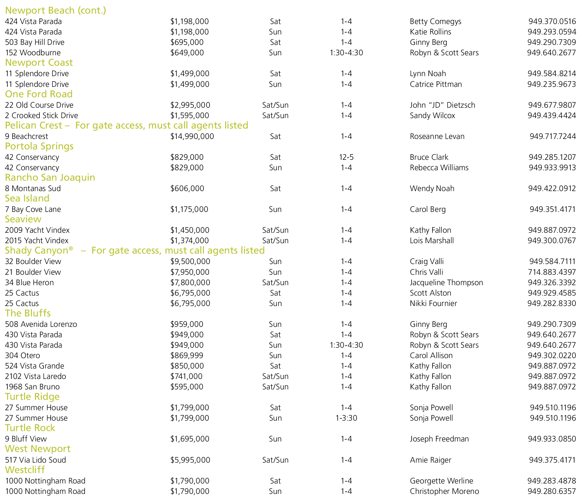 Newport Beach (cont.) 424 Vista Parada $1,198,000 Sat 1-4 Betty Comegys 949.370.0516 424 Vista Parada $1,198,000 Sun 1-4 Katie Rollins 949.293.0594 503 Bay Hill Drive $695,000 Sat 1-4 Ginny Berg 949.290.7309 152 Woodburne $649,000 Sun 1:30-4:30 Robyn & Scott Sears 949.640.2677 Newport Coast 11 Splendore Drive $1,499,000 Sat 1-4 Lynn Noah 949.584.8214 11 Splendore Drive $1,499,000 Sun 1-4 Catrice Pittman 949.235.9673 One Ford Road 22 Old Course Drive $2,995,000 Sat/Sun 1-4 John “JD” Dietzsch 949.677.9807 2 Crooked Stick Drive $1,595,000 Sat/Sun 1-4 Sandy Wilcox 949.439.4424 Pelican Crest – For gate access, must call agents listed 9 Beachcrest $14,990,000 Sat 1-4 Roseanne Levan 949.717.7244 Portola Springs 42 Conservancy $829,000 Sat 12-5 Bruce Clark 949.285.1207 42 Conservancy $829,000 Sun 1-4 Rebecca Williams 949.933.9913 Rancho San Joaquin 8 Montanas Sud $606,000 Sat 1-4 Wendy Noah 949.422.0912 Sea Island 7 Bay Cove Lane $1,175,000 Sun 1-4 Carol Berg 949.351.4171 Seaview 2009 Yacht Vindex $1,450,000 Sat/Sun 1-4 Kathy Fallon 949.887.0972 2015 Yacht Vindex $1,374,000 Sat/Sun 1-4 Lois Marshall 949.300.0767 Shady Canyon ® – For gate access, must call agents listed 32 Boulder View $9,500,000 Sun 1-4 Craig Valli 949.584.7111 21 Boulder View $7,950,000 Sun 1-4 Chris Valli 714.883.4397 34 Blue Heron $7,800,000 Sat/Sun 1-4 Jacqueline Thompson 949.326.3392 25 Cactus $6,795,000 Sat 1-4 Scott Alston 949.929.4585 25 Cactus $6,795,000 Sun 1-4 Nikki Fournier 949.282.8330 The Bluffs 508 Avenida Lorenzo $959,000 Sun 1-4 Ginny Berg 949.290.7309 430 Vista Parada $949,000 Sat 1-4 Robyn & Scott Sears 949.640.2677 430 Vista Parada $949,000 Sun 1:30-4:30 Robyn & Scott Sears 949.640.2677 304 Otero $869,999 Sun 1-4 Carol Allison 949.302.0220 524 Vista Grande $850,000 Sat 1-4 Kathy Fallon 949.887.0972 2102 Vista Laredo $741,000 Sat/Sun 1-4 Kathy Fallon 949.887.0972 1968 San Bruno $595,000 Sat/Sun 1-4 Kathy Fallon 949.887.0972 Turtle Ridge 27 Summer House $1,799,000 Sat 1-4 Sonja Powell 949.510.1196 27 Summer House $1,799,000 Sun 1-3:30 Sonja Powell 949.510.1196 Turtle Rock 9 Bluff View $1,695,000 Sun 1-4 Joseph Freedman 949.933.0850 West Newport 517 Via Lido Soud $5,995,000 Sat/Sun 1-4 Amie Raiger 949.375.4171 Westcliff 1000 Nottingham Road $1,790,000 Sat 1-4 Georgette Werline 949.283.4878 1000 Nottingham Road $1,790,000 Sun 1-4 Christopher Moreno 949.280.6357